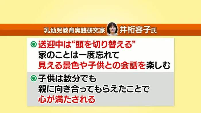 乳幼児教育実践研究家の井桁容子さんは、「送迎中は家のことを忘れて、子供との会話を楽しんでほしい。数分の会話でも子供は満たされる」とアドバイス。