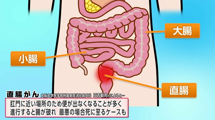 直腸がんに詳しい医師によると、肛門に近い場所のため、便が出なくなることが多く、進行すると腸が破れ、最悪の場合死に至るケースもあるといいます。