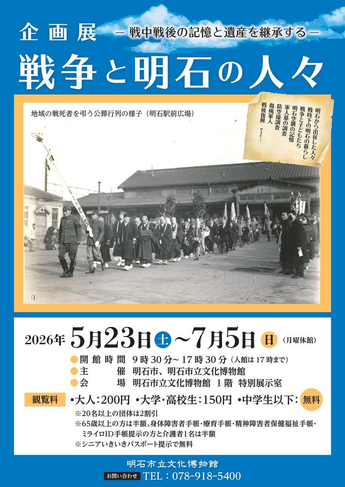 展覧会名:企画展「戦争と明石の人々―戦中戦後の記憶と遺産を継承する―」会期:2026年5月23日(土)- 2026年7月5日(日)