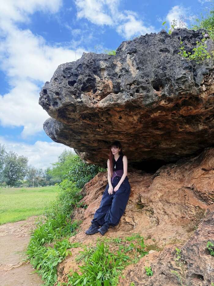 続く写真では、大きな岩が頭上にせり出す、ハワイらしい雄大な自然を感じるロケーションで、ふと一息つくような自然体の表情を見せています。
