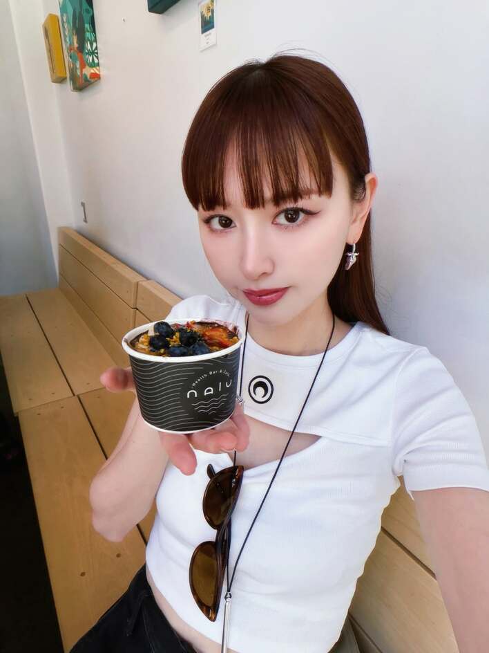 フルーツがたっぷり乗ったアサイーボウルを手に、カメラへ視線を向ける鈴木さん。