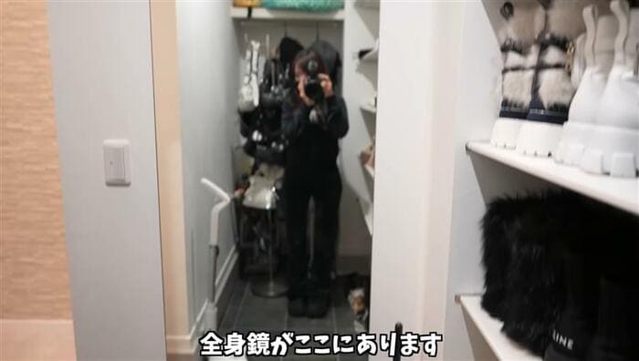お出かけの時にスムーズに取り出せるよう、バッグや帽子も保管されています。加えて、全身鏡もあるそうで、日々のコーデチェックがしやすい作りとなっています。