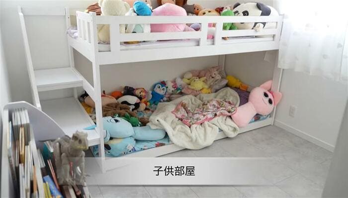2段ベッドになっているようですが、「よくケンカしているけど、一緒に寝たいらしい」と、仲良くたくさんのぬいぐるみに囲まれながら2人の子供は1段目のベッドで寝ているようです。