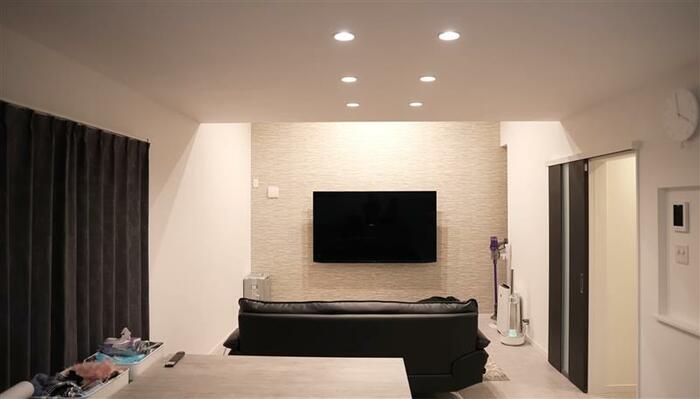 続いて、リビングを見ていくと、大きなテレビが壁にかけられています。ソファだけでなく大きなビーズクッションもあり、基本的にここでのんびり過ごすとのこと。