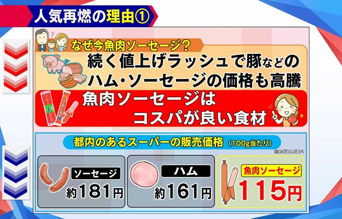 そんな「魚肉ソーセージ」の人気が再燃した理由の1つに、近年続く値上げラッシュで豚などを使用したハム・ソーセージ類の価格が高騰した事に対して、魚肉ソーセージはコスパが良いということがあげられます。