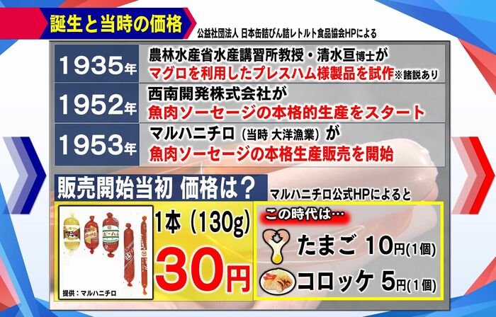 1935年、当時の農林水産省水産講習所の教授が、マグロを使ってツナハムを試作販売したのが最初といわれている「魚肉ソーセージ」(※発祥は諸説あり)。