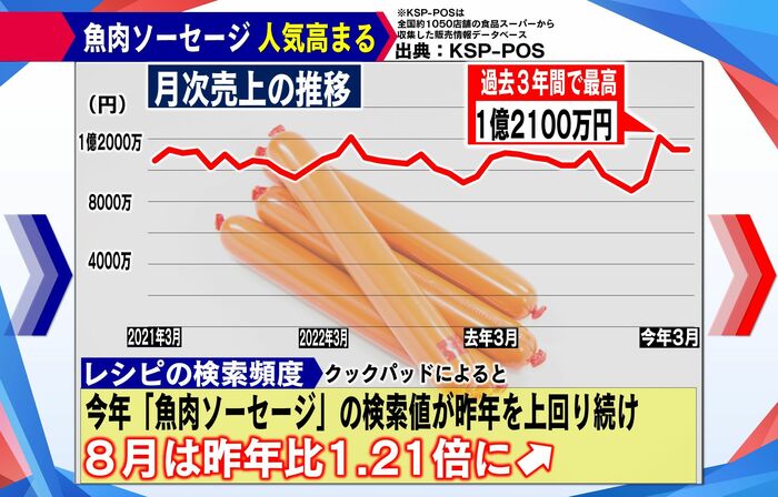 全国のスーパーなどの販売データによると、2024年3月の魚肉ソーセージの売り上げは1億2100万円と、過去3年間で最高タイ。