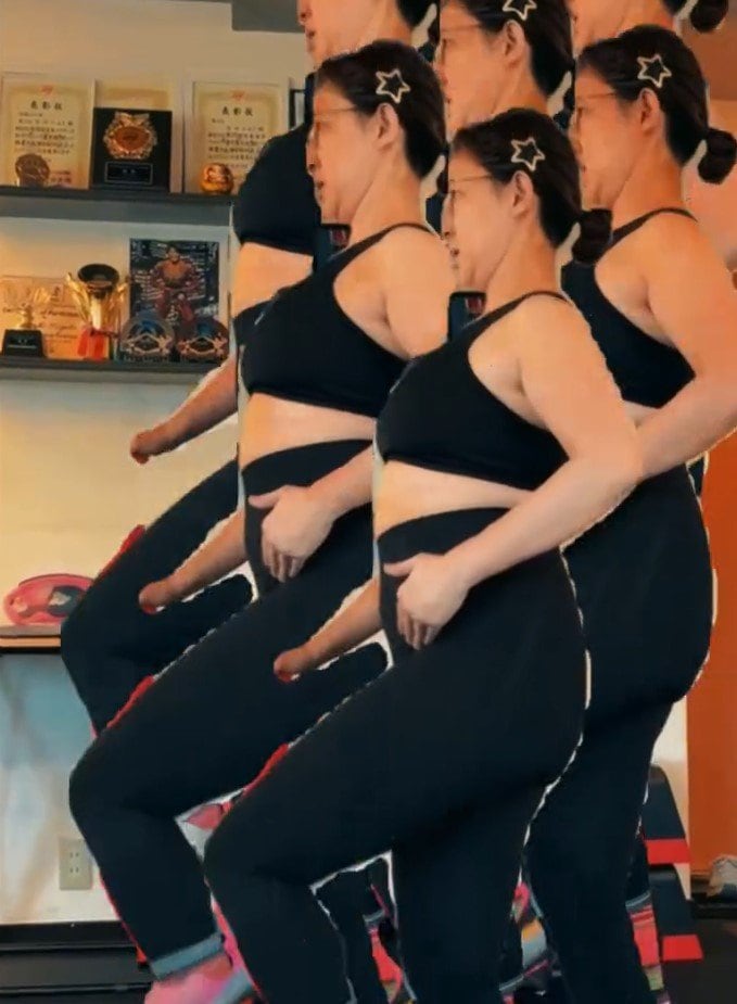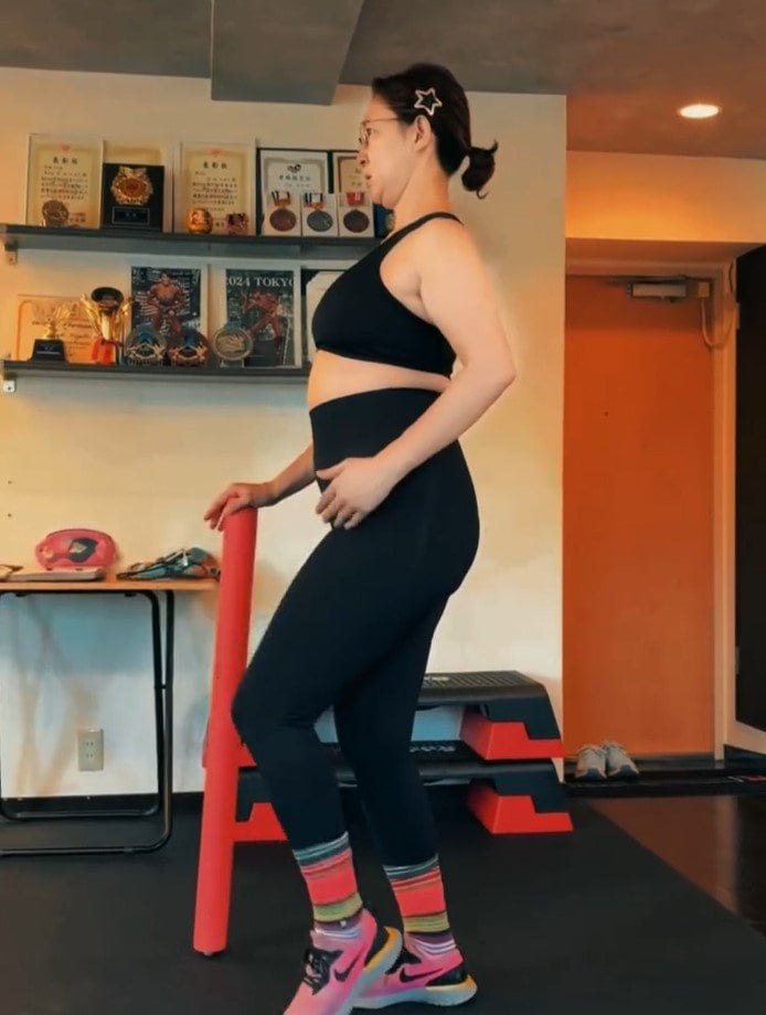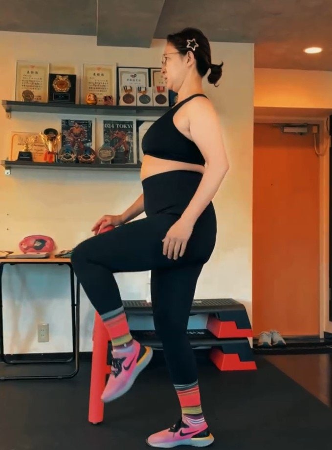 この日は、「中年太りでも動ける体を目指して踏ん張るわよ〜!」というコメントとともにパーソナルスタジオと思われる一室で運動する自身の動画を公開しました。