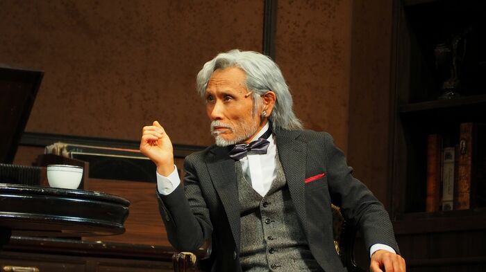 そんなポアロの相棒・ヘイスティングス役の鈴木さんは一幕、二幕冒頭でストーリーテラー的役割も担当。客席に降り立ち、前列の観客と愉快なやりとりを繰り広げ、作品を盛り上げました。