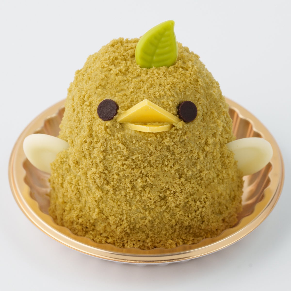 名古屋コーチン卵を使用した濃厚なプリンの下に、柚子のジュレをしのばせ、緑茶のババロアで包み込みました。緑茶風味のクラムがさわやかな緑色で季節感を演出し、頭には新緑をイメージした葉っぱのチョコレートをあしらいました。緑茶の香りと柚子のアクセントが織りなす、見ても食べても新緑の季節を感じるぴよりんです。