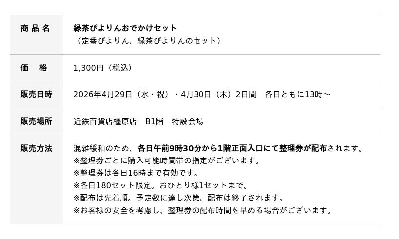 本企画は、橿原店開店40周年およびぴよりん誕生15周年を記念した特別企画です。今回は初の試みとして、近鉄名古屋駅から近鉄百貨店橿原店最寄りの近鉄大和八木駅まで、近畿日本鉄道が誇る人気列車「名阪特急ひのとり」で運搬されます。名古屋と奈良を結ぶ特急列車で届けられるのは、定番ぴよりんに加え、新緑の季節を感じられる「緑茶ぴよりん」。特別なぴよりん体験をぜひお楽しみください。