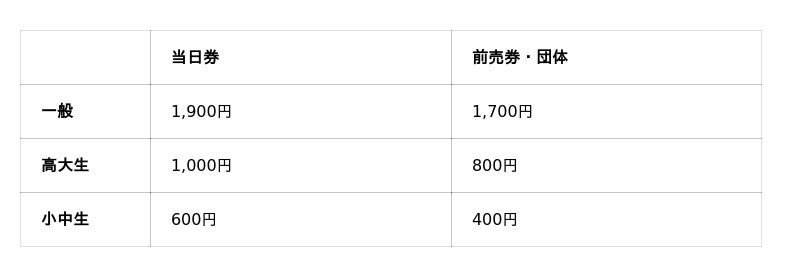 ※身体障害者手帳、療育手帳、精神障害者保健福祉手帳、デジタル障害者手帳「ミライロID」の提示者とその介護者1名および特定医療費(指定難病)受給者証、特定疾患医療受給者証、先天性血液凝固因子障害等医療受給者証、小児慢性特定疾病医療受給者証の提示者は観覧無料