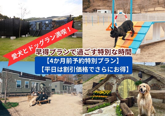 大型ドッグランオープン記念!早得プラン販売開始大型ドッグランオープンを記念して、早期宿泊予約キャンペーンとして4か月前にご予約のお客様限定のドッグラン利用券付&愛犬のおやつ付プランの販売を実施します。この機会にぜひ公式ホームページの早得プランからお申込みください。