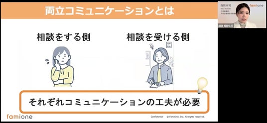 「子どもを願うすべての人によりそい 幸せな人生を歩める社会をつくる」をビジョンに掲げ、法人の従業員向け福利厚生や自治体の住民向け支援を行うヘルスケアサポートサービス「ファミワン」 https://famione.com/benefit/ などを展開する株式会社ファミワン(本社:東京都渋谷区、代表取締役:石川勇介)は、2026年3月27日(金)、学校法人日本医科大学(所在地:東京都文京区、理事長:弦間 昭彦)の教職員を対象に、オンラインセミナー「医療職の未来を守るプレコンセプションケア ―妊活・不妊治療と仕事の両立を尊重し合える風土作り―」を実施いたしました。