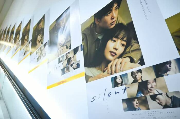 エスカレーターを登ると、『silent』とタワーレコードのコラボポスターがずらり。