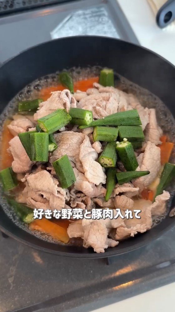 だし汁が入ったお鍋に野菜と豚肉をたっぷりと入れて煮込み、めんつゆと砂糖を少し入れれば完成とのことで、時短したい時の参考になりそうです。