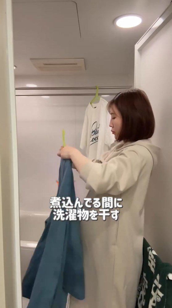 お鍋で煮込んでいる間にはさきほど洗ったばかりの洗濯物を干していきます。第2子を妊娠中の西野さん、おなかがふっくらしていることを忘れてしまうくらい、スムーズに家事をこなしていきます。