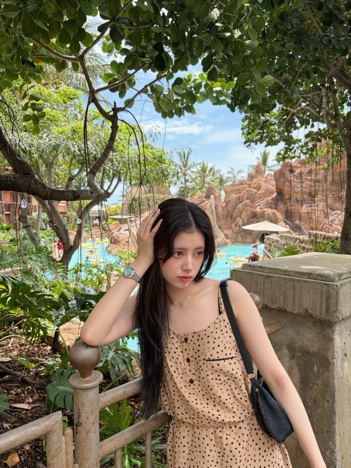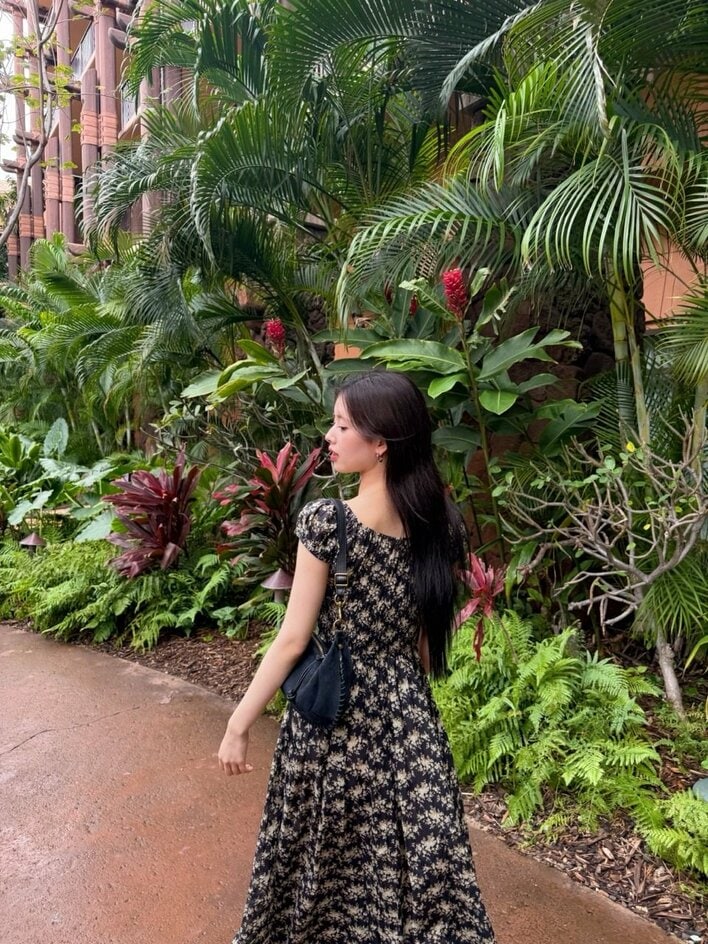 リゾート内を散策する1枚では、黒の花柄ワンピースをまといどこを切り取っても絵になるショットを披露。風にそよぐヤシの木をバックに、まるで映画のワンシーンのような美しい立ち姿を見せています。