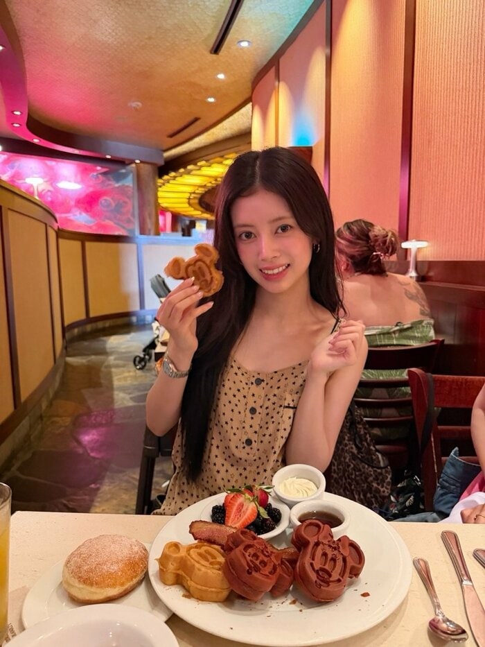 フレッシュなイチゴやブラックベリー、ベーコンなどが彩りよく盛り付けられ、ミッキーやミニーの形をしたワッフルが並ぶプレートを前に、目を輝かせています。ワッフルを手ににっこり微笑む姿も、可愛らしさたっぷりです。