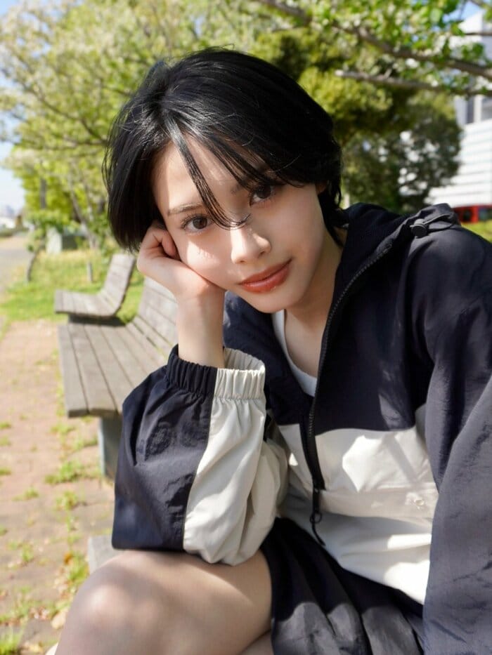 そこには、ネイビーとクリーム色の組み合わせになったスポーツジャケットを羽織り、頰づえをつきながら、透き通るような瞳で見つめる安斉さんの姿が。サラサラな前髪が目元に少しかかり、大人っぽい雰囲気に包まれています。