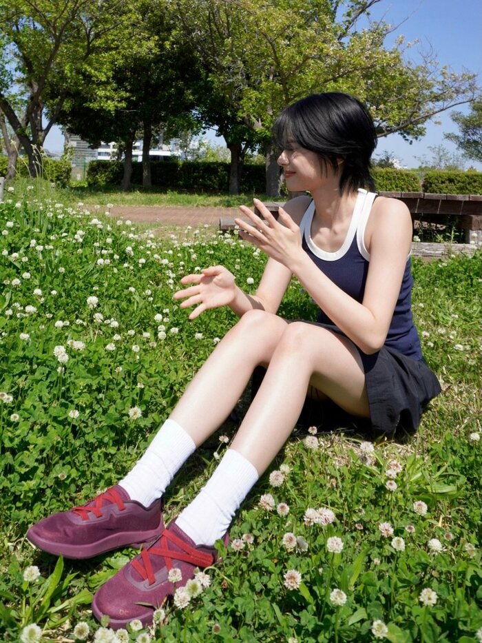 また、一面小さな白のお花が咲いた場所に、ジャケットを脱いでタンクトップ姿で笑顔で座るショットも!下はショートパンツをはいていたようで、スラッと伸びた美脚が太陽の光で輝いています。