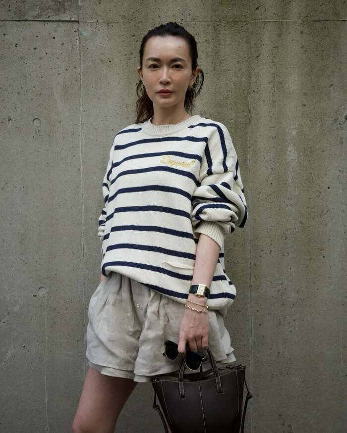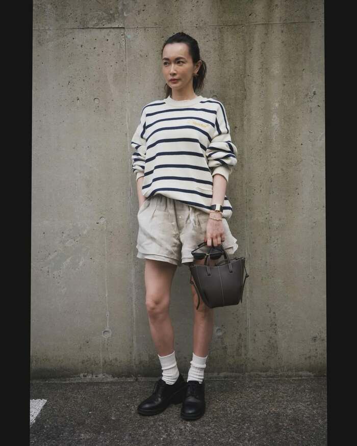 その写真を見てみると、ボーダーのスウェットにベージュのショートパンツを合わせた、シンプルでありながら洗練されたコーディネートの長谷川さんがカメラを真っすぐ見つめています。