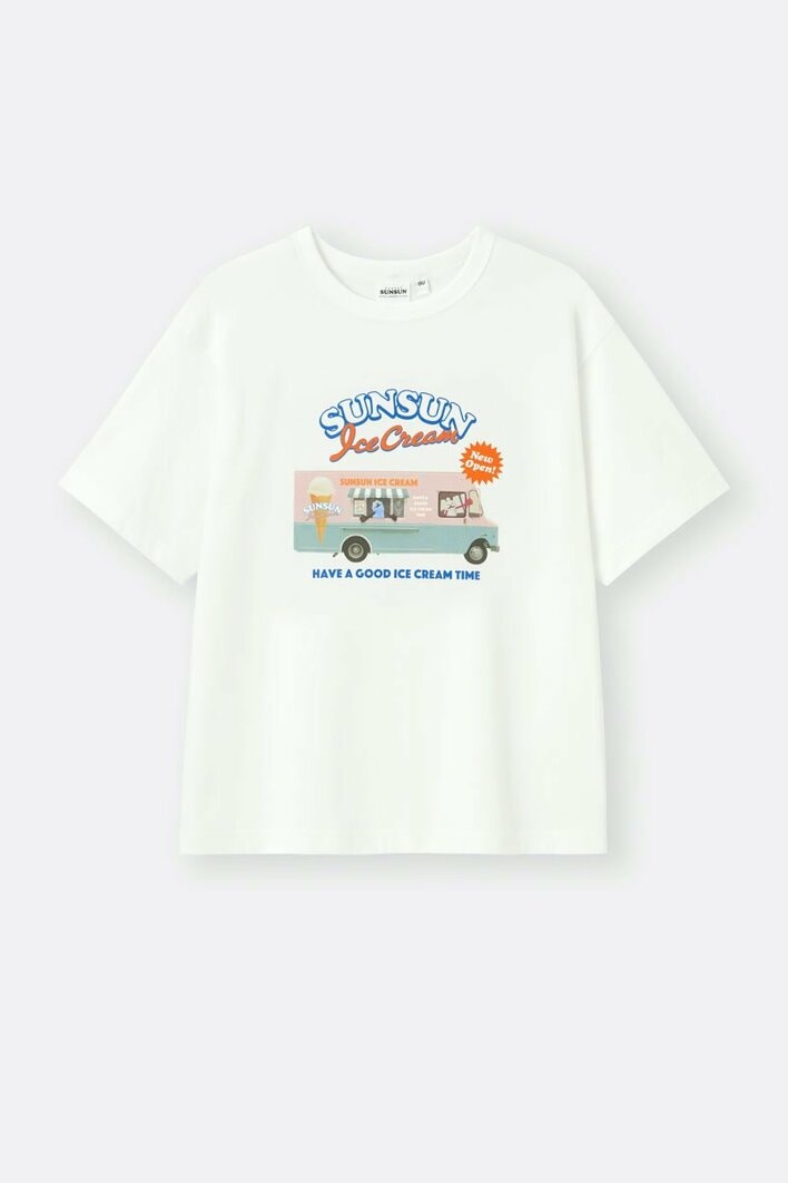 アイスクリームショップのワゴンやメニュー表をデザインしたグラフィックTシャツは、日常使いしやすいカジュアルな仕上がりに。