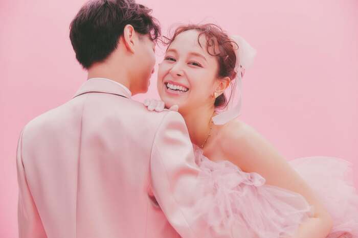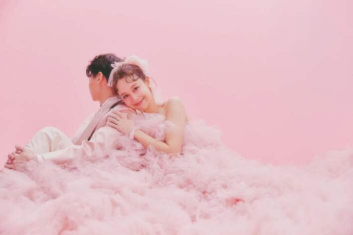 淡いピンクドレスに身を包んだ佐藤さんはカメラ目線でニッコリ。ドレスのチュールが画面いっぱいに広がり、まるで雲の上にいるような幻想的な雰囲気になっています。