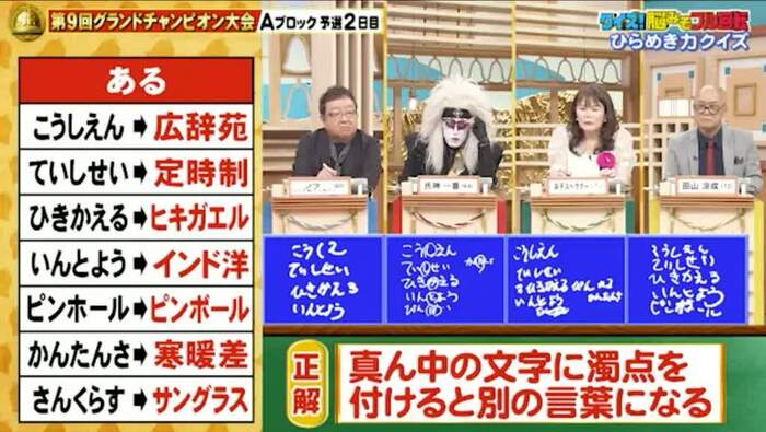 正解は「真ん中の文字に濁点(だくてん)を付けると別の言葉になる」。残念ながら全員不正解でした。
