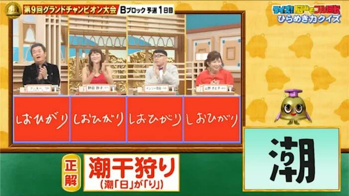 正解は「潮干狩り(潮『日』が『り』)」。全員正解!