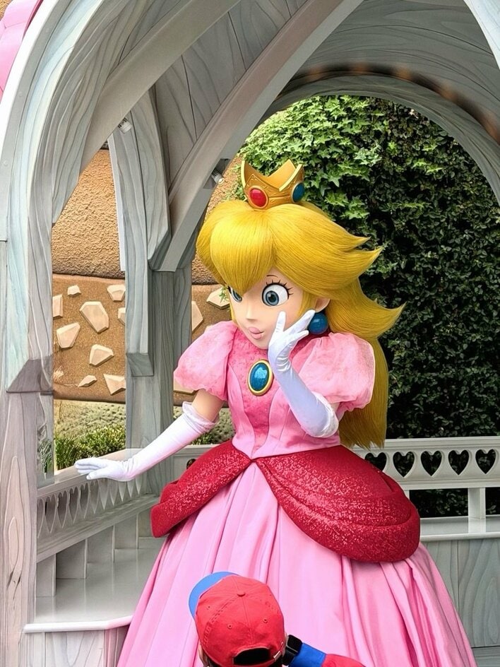 園内では「スーパーマリオ」シリーズに登場するキャラクター・ピーチ姫に遭遇したようで、ピーチ姫が優しく手を振っている姿をパシャリ!