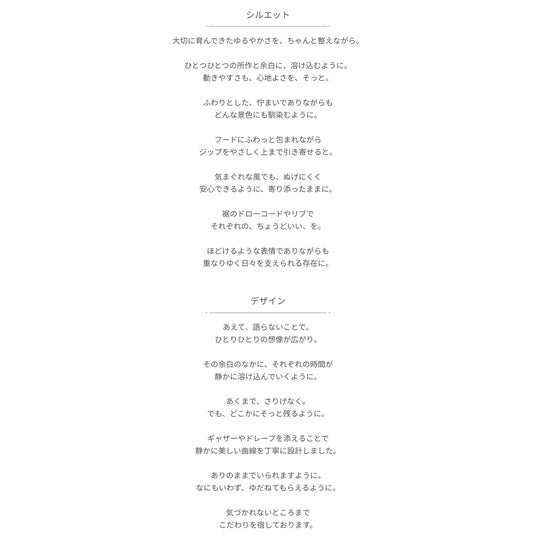 「大切なあなた」と「あなたの大切な人」を、ちゃんと守れるように。紫外線防止指数の最高レベル【UPF50+】に。撥水加工、と。抗菌防臭のやさしさを添えて、いつまでも心地いいユルさを。