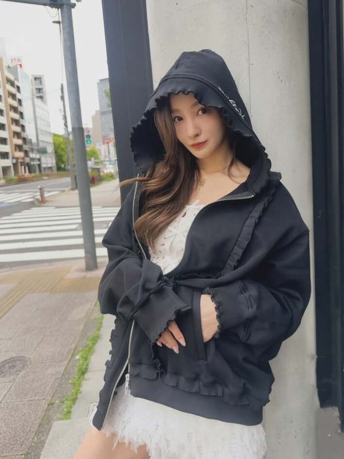 今回の投稿で板野さんは「ふりふりパーカー」とつづり、黒のパーカーを羽織り、フードをすっぽりかぶってこちらを見つめたショットを公開しました。パーカーの袖口やフードのフチには、細やかなギャザーがぐるりと施されていて、ストリート感の中にかわいらしさがにじむデザインとなっています。