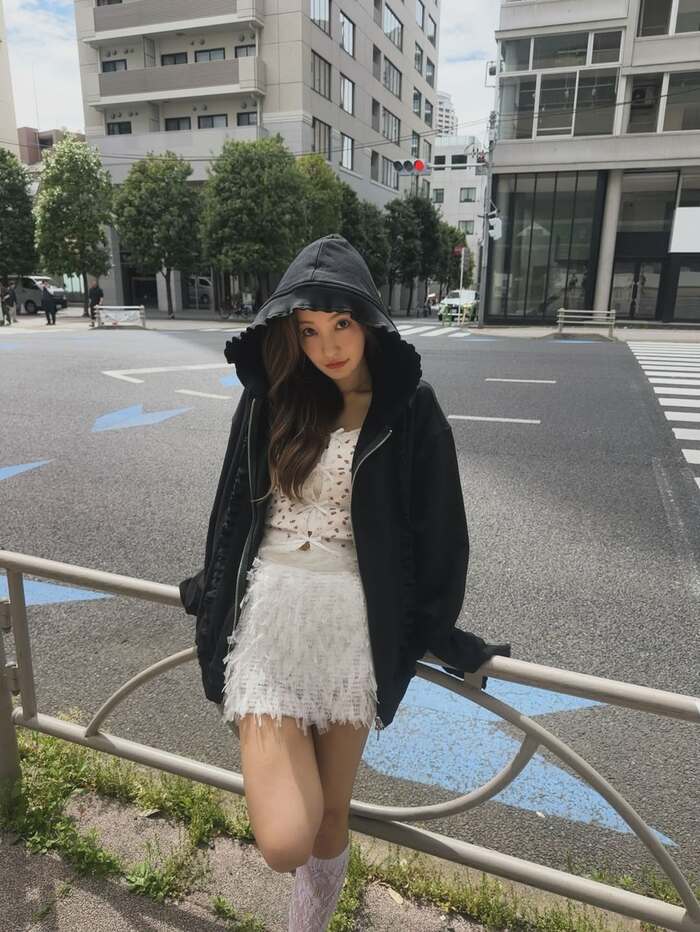 そして、インナーには繊細なレースやリボンがあしらわれたキュートなトップス、ボトムにはフェザー調の膝上ミニスカートを合わせ、甘さとエッジを絶妙にミックス!柵に軽く体を預けながら膝をきゅっと曲げたポーズは、大胆にのぞく太ももに思わず目を奪われます。