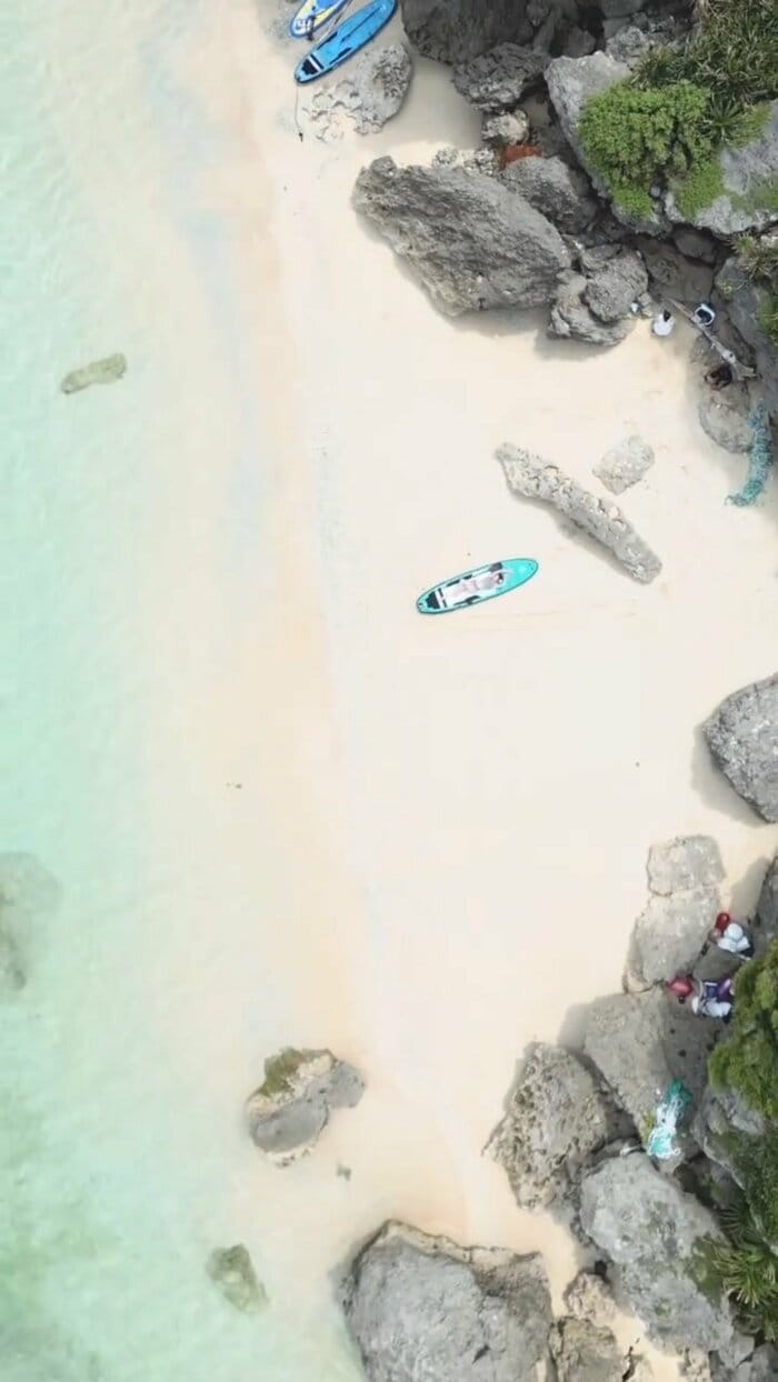 ラストはドローンが再び上昇し、エメラルドグリーンの海と白砂のビーチが広がる絶景で締めくくられました。