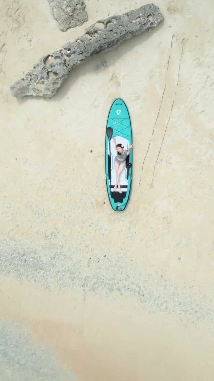 砂浜での美しいカットから始まる動画には早速ドローンが使用されており、ターコイズ色のボードの上に座り、海風を全身で感じている櫻井さんの姿が映し出されています。