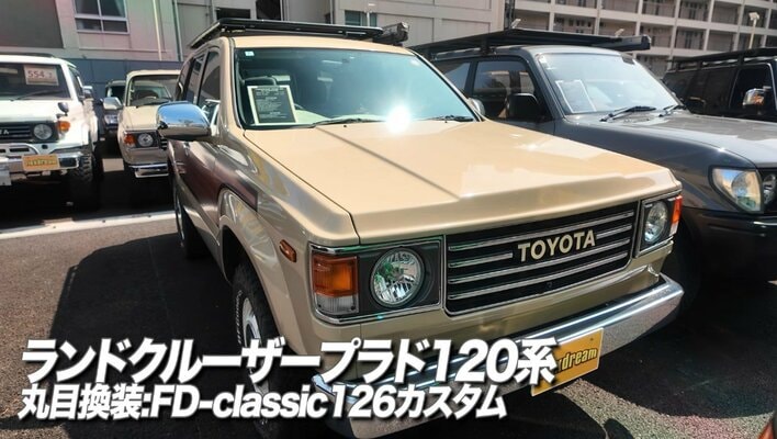 まずは、角張った厚みのあるボディーをしたランドクルーザープラド120系。フェンダー、ボンネット、フロントパネルまで全て変え、ヘッドライトは丸目にカスタムされています。武骨さとかわいさを兼ね備えたアイコニックなフェイスデザインが目を引きますね。