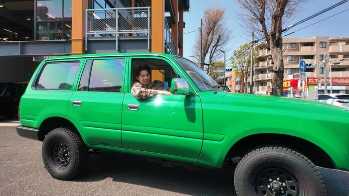 さらに、1995年式のランドクルーザー80の前回りをランドクルーザー60のフェイスに変えた、鮮やかな緑色をした1台も登場し、「超かっこよくない!?」と大興奮の中尾さん。ボディーは元々純正にない色をオールペイントしているそうで、「きれい!」と声を漏らし、うっとりです。