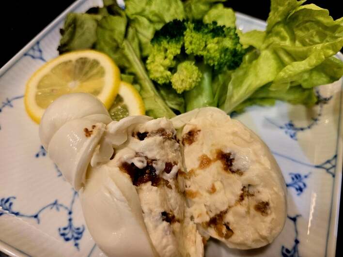 「白イチジク入りのブッラータチーズ」と紹介した写真には、真っ白なチーズの中にイチジクが入った贅沢な一品が。レタスとブロッコリー、輪切りにしたレモンが添えられたオシャレな一皿を、シャンパンと一緒に楽しんだそうです。