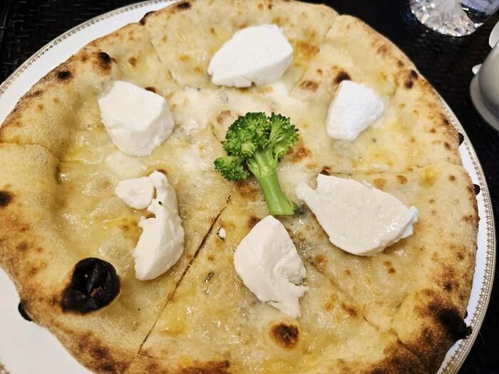 香ばしく焼き上がったピザは、チーズがたっぷりとのり、中央にブロッコリーが添えられたボリューム満点の一品!画面越しでも食欲そそる良い香りが漂ってきそうです。