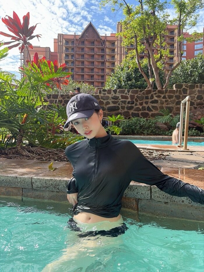 また、南国感あふれる景色をバックに、おへそを見せたスタイルでプールにつかるショットも。