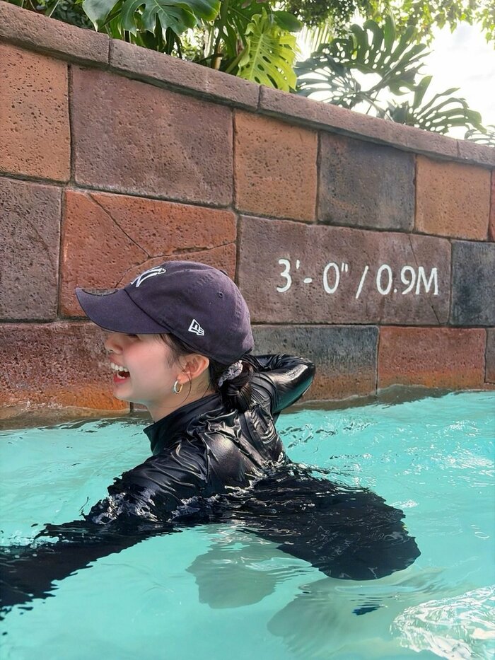 そこには、紫のキャップをかぶり、黒のラッシュガードを羽織った姿でプールに入るRIMAさんの姿が!キラキラした笑顔を浮かべていて、写真から楽しそうな笑い声が聞こえてきそうです。