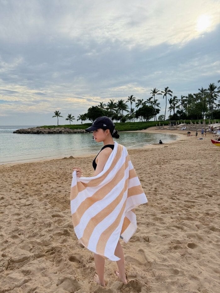 さらに、ラッシュガードを脱ぎ、ストライプ柄の大きなタオルを肩にかけながら砂浜にたたずむショットや…。