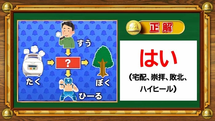 正解は「はい(宅配・崇拝・敗北・ハイヒール)」。