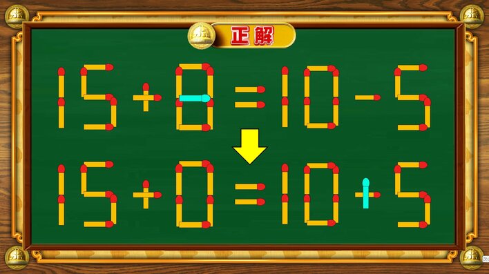 「15+8=10-5」。この式のマッチ棒を1本だけ動かして正しい式にしてください。