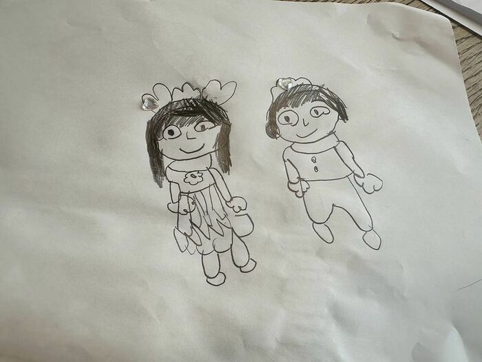 公開された絵を見ると、お花が描かれたドレスを着た女の子と隣には男の子と思われる2人が描かれていました。絵を見た藤本さんは「すでに私より上手です」と褒めていました。