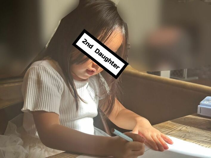 今回の投稿では「次女はお絵描き大好き」とつづり、次女が鉛筆を持って紙になにかを描いている様子をアップしています。