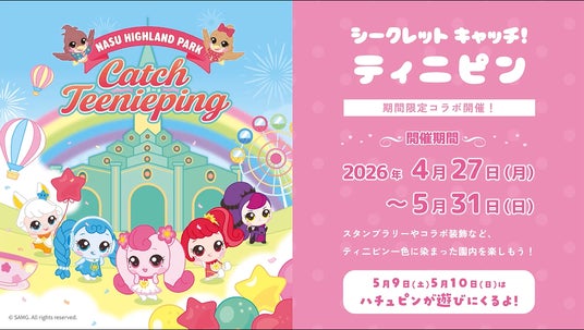 NPD(日本駐車場開発株式会社)グループのRX(地域変革)を掲げる日本テーマパーク開発株式会社の傘下の那須ハイランドパークにて、2026年4月27日(月) より『シークレット [A島弘1] キャッチ!ティ二ピン』とのコラボイベントが開始します。『シークレット キャッチ!ティニピン』は2020年から海外で放送されている幼稚園児や小学生低学年中心に大人気の3DCGアニメ『キャッチ!ティニピン』のシリーズ3作品目です。今回のコラボではコラボ仕様のフォトスポットやスタンプラリー、フードメニュー、限定グッズが登場するほか、限定ノベルティ付きのファンタジーパスセット(乗り放題付き入園券)の販売も実施します。