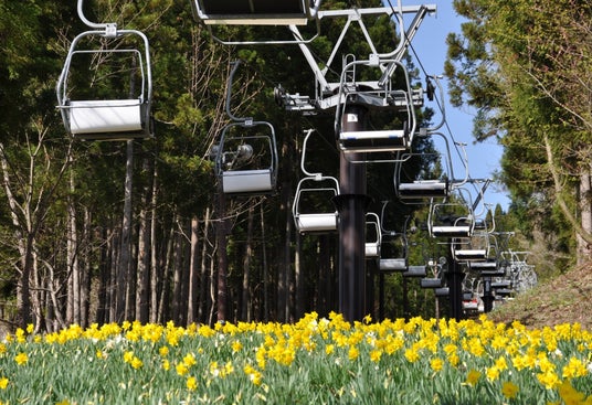 ゲレンデ一面にはスイセン畑がお花の中を散策いただけます おすすめはリフト片道乗って頂き下りながらお花を観賞いただくコースです 春の新緑の山並みもきれいです