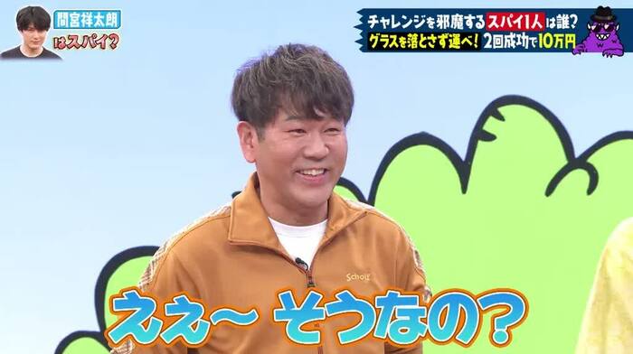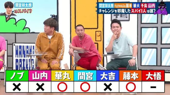 ここでは、合計6問正解してチャレンジ成功=プレーヤーが10万円獲得、華丸さん、ノブさん、間宮さんがスパイ容疑者となりました。